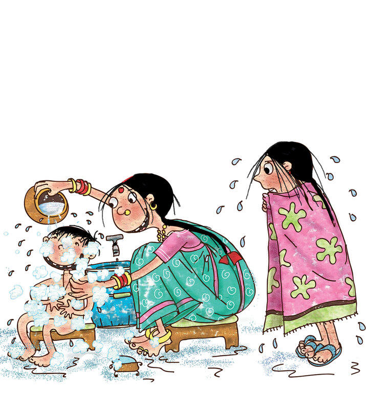 "Start by getting yourself wet,” said Mummy. “Then apply soap all over!” Riya and Rohan giggled as Mummy’s ticklish fingers soaped them up. “Then it’s time to rinse off!” “And dry with a clean towel!” “SUPERCLEAN!” WOOF! “It’s Jimmy’s turn next!”