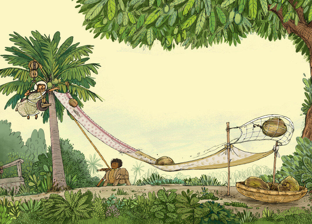 "Ready?" shouted Sooraj. "Ready!" said Ammachi. 4/15 français "We’ll only pick the ripe ones, okay? The ones that are brown all over... Watch out! Here they come!" WHOOOSH... WHUMP! 5/15 français "Now to get the husk off…" POTCH! CRAANKK! 6/15 français Sooraj’s stomach went: "GRRRRRR!" Ammachi giggled. 7/15 français "Then we crACK the shell… like THIS!" KHATAK! 8/15 français "And grrrrrraaaaate the frrrrrrrruuuit!" 9/15 français "Toss it into the pan with all the other ingredients…" "It smells SO good, Ammachi!" 10/15 français "Then we pour it all out on to a tray… Wait for it to cool, baba!" 11/15 français "Now cut it into neat little slices…" SQUEAK SQUEAK 12/15 français "YIPPEE! Our coconut barfi is ready to be eaten!" "YUM YUM YUM!" 13/15 français Ammachi's barfi was made using SIMPLE MACHINES! Simple machines make it easier to do work. There are six kinds of simple machines:1. Inclined plane 2. Lever 3. Wheel and Axle 14/15 français 4. Wedge 5. Pulley6. Screw Can you identify the simple machines that Sooraj and Ammachi used in the process of making coconut barfi? 15/15 français The end This book was made possible by Pratham Books' StoryWeaver platform. Content under Creative Commons licenses.