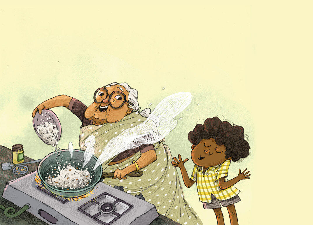 "Toss it into the pan with all the other ingredients…" "It smells SO good, Ammachi!"